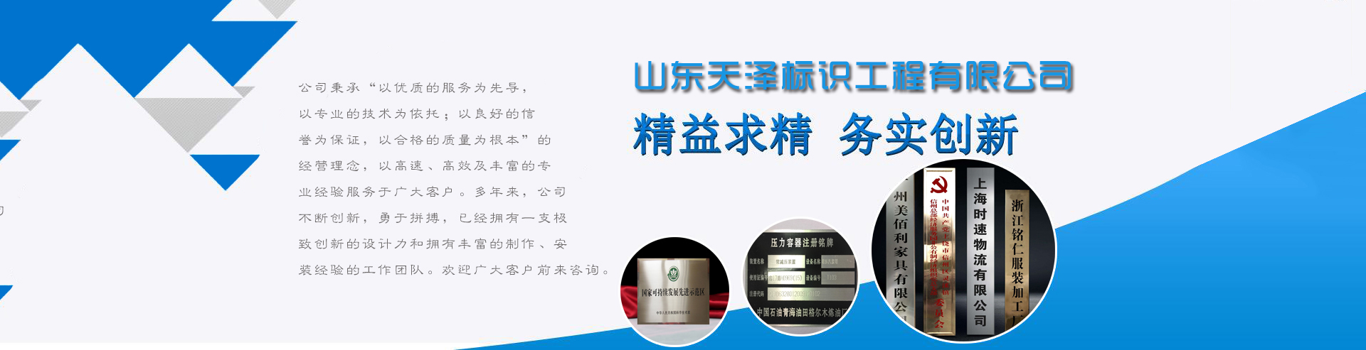 山東天澤標識工程有限公司是一家集創意設計,生產制造,安裝服務,售后保障為一體的多元化公司。我們擁有先進的設備,專業的人才,專業從事蝕刻,仿古,做舊,絲印,烤漆等工藝加工。主要生產機器銘牌、科室牌、樓棟牌、門牌、不銹鋼牌、銅牌、鋁牌、鈦金牌、砂金牌、授權牌、道路標識牌及各類金屬板材的裝飾花紋,同行可代工。 我們一直秉承“以質量、效率、服務博得客戶的滿意,以誠信、合作雙贏求得發展”作為核心價值,立足創新產品質量,誠信服務,真誠合作,共同發展,是我們始終如一的追求。為客戶提供優質的產品是我們永恒的方針。我們將不斷超越自我,一如既往地為客戶創造價值,提供更優質的產品和服務!